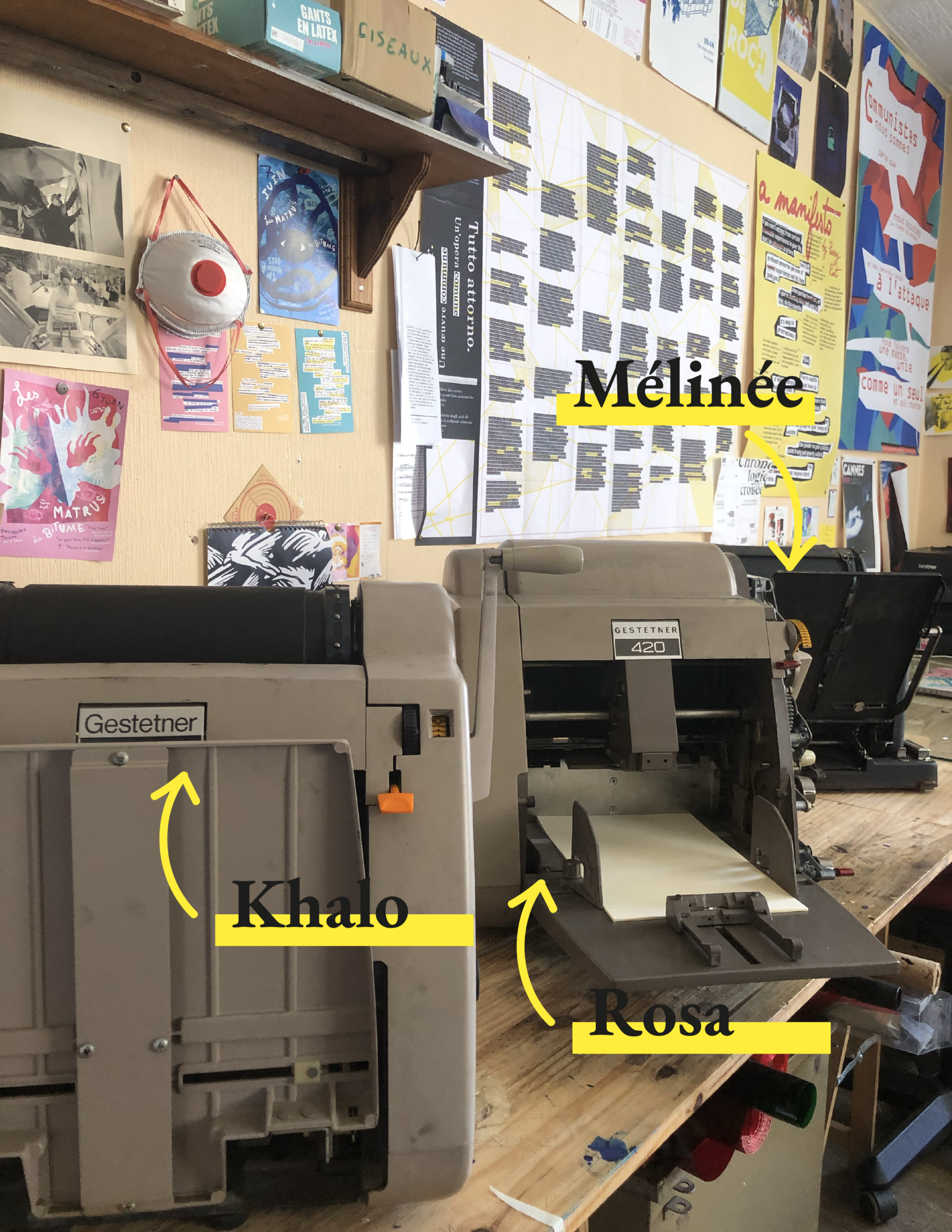 Nous travaillons autant que possible avec des papiers recyclés ou revalorisés. Les formats sont parfois adaptés aux ressources disponibles afin de limiter les pertes.